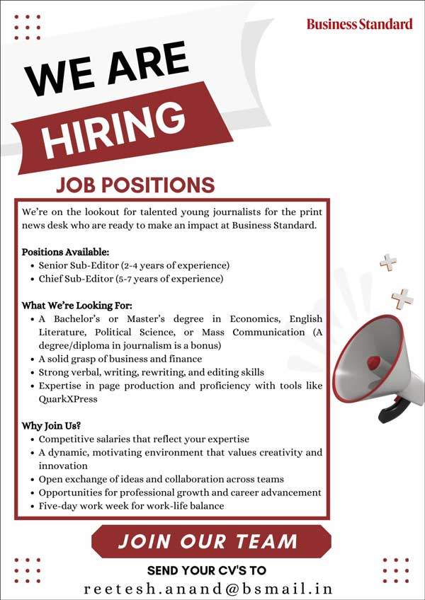 यदि आप पत्रकार हैं और मीडिया के क्षेत्र में नई नौकरी की तलाश कर रहे हैं तो यह खबर आपके काफी काम की है। दरअसल, प्रमुख बिजनेस अखबार ‘बिजनेस स्टैंडर्ड’ (Business Standard) को अपनी प्रिंट न्यूज डेस्क के लिए सब एडिटर और चीफ सब एडिटर के पदों पर पत्रकारों की जरूरत है।