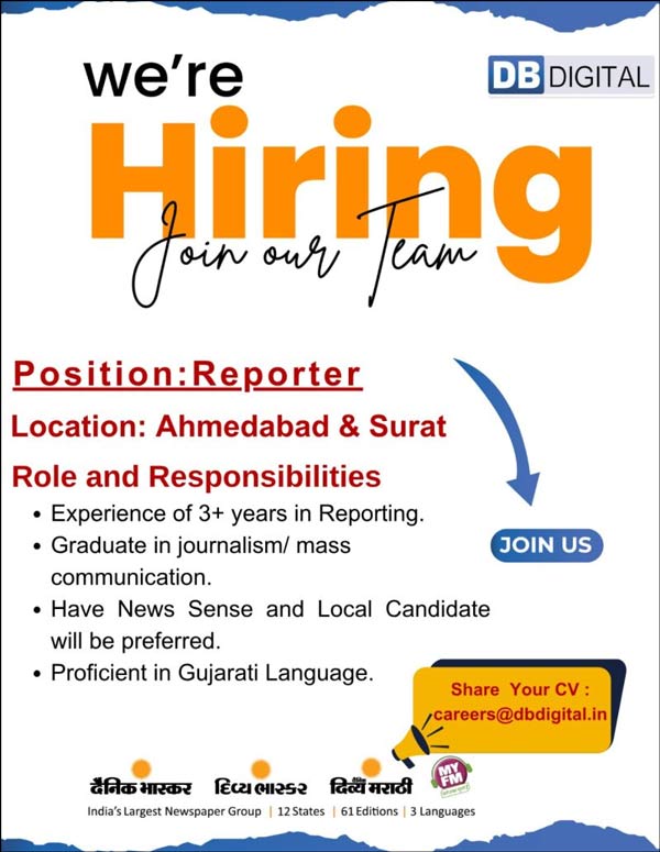 नई नौकरी की तलाश में जुटे पत्रकारों के लिए ‘दैनिक भास्कर’ (Dainik Bhaskar) समूह से जुड़ने का अच्छा मौका है। दरअसल, इस समूह की डिजिटल डिवीजन ‘डीबी डिजिटल’ (DB Digital) को अहमदाबाद और सूरत में सिटी रिपोर्टर्स की जरूरत है। इसके लिए इच्छुक व योग्य उम्मीदवारों से आवेदन मांगे गए हैं।