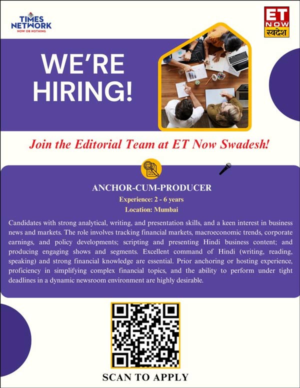 हिंदी बिजनेस न्यूज जगत में नई नौकरी तलाश रहे पत्रकारों के लिए बड़ा मौका है। दरअसल, देश के प्रमुख न्यूज नेटवर्क्स में शुमार ‘टाइम्स नेटवर्क’ के हिंदी बिजनेस न्यूज चैनल ‘ईटी नाउ स्वदेश’ (ET Now Swadesh) ने एंकर-कम-प्रड्यूसर पद के लिए आवेदन आमंत्रित किए हैं।