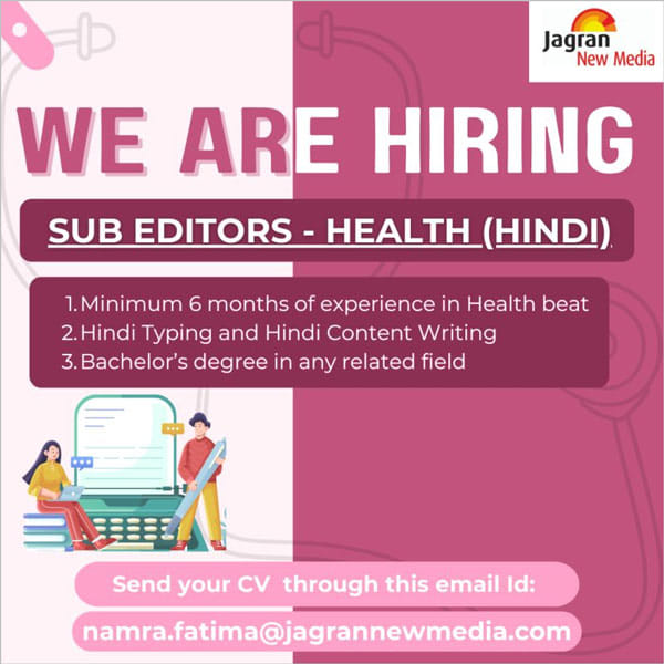 जागरण समूह की डिजिटल कंपनी 'जागरण न्यू मीडिया' (Jagran New Media) को हेल्थ बीट पर हिंदी में काम करने के लिए सब एडिटर्स की जरूरत है।