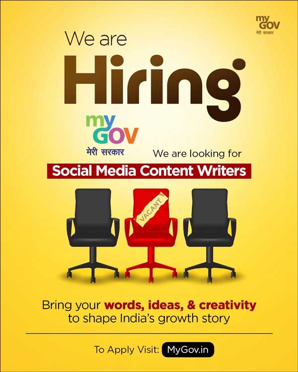 सरकारी डिजिटल प्लेटफॉर्म ‘माईगव इंडिया‘ (MyGovIndia) में सोशल मीडिया कंटेंट राइटर के पद पर वैकेंसी, है। इस पद पर नियुक्ति के लिए योग्य व इच्छुक आवेदकों से आवेदन आमंत्रित किए गए हैं।