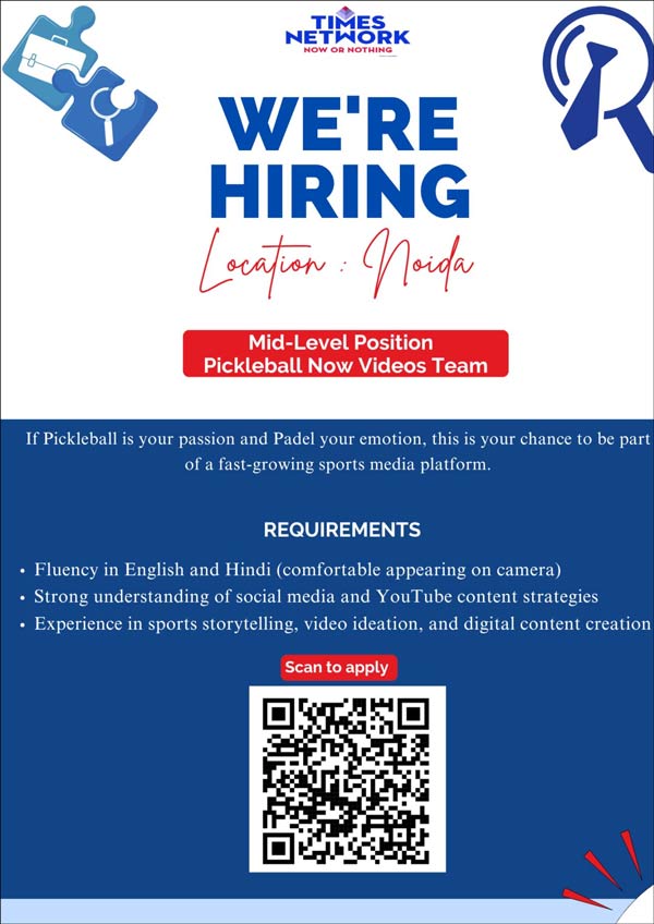 नई नौकरी की तलाश में जुटे युवाओं के पास ‘टाइम्स नेटवर्क’ (Times Network) से जुड़ने का अच्छा मौका है। दरअसल, टाइम्स नेटवर्क को अपने स्पोर्ट्स मीडिया प्लेटफॉर्म ‘Pickleball Now’ की वीडियोज टीम में क्रिएटिव प्रोफेशनल की जरूरत है। इस पद पर नियुक्ति के लिए योग्य व इच्छुक आवेदकों से आवेदन मांगे गए हैं।