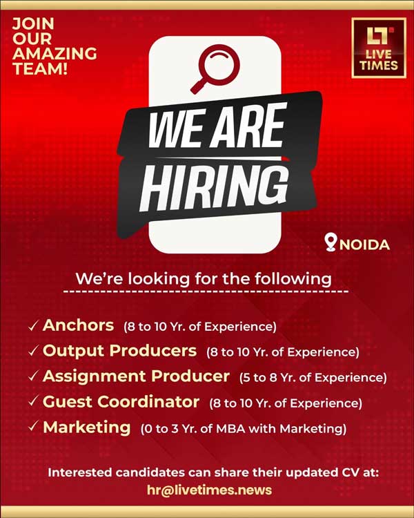 ग्लोबल मल्टीकास्ट न्यूज हब ‘लाइव टाइम्स’ (Live Times) ने एंकर्स और रिपोर्टर्स समेत कई पदों पर भर्ती के लिए वैकेंसी निकाली है।