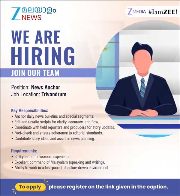 कंपनी के मुताबिक, इस पद पर नियुक्ति के लिए उम्मीदवार के पास 3 से 6 साल का न्यूज रूम का अनुभव होना चाहिए। मलयालम भाषा पर मजबूत पकड़ जरूरी है।