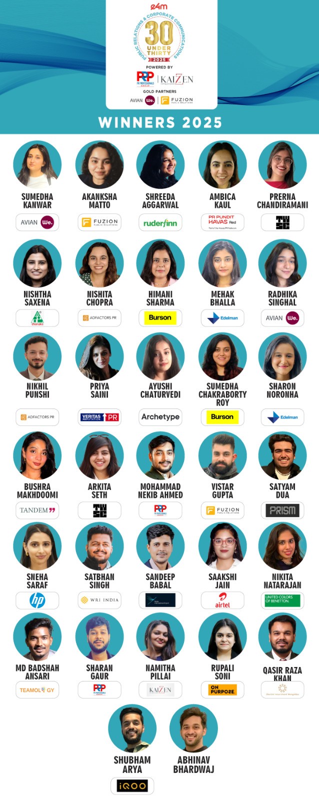अब पेश है PR & Corp Comm 30 Under 30 2025 के पांचवें संस्करण की बहुप्रतीक्षित सूची। इस सूची में किसी भी तरह की रैंकिंग नहीं की गई है-