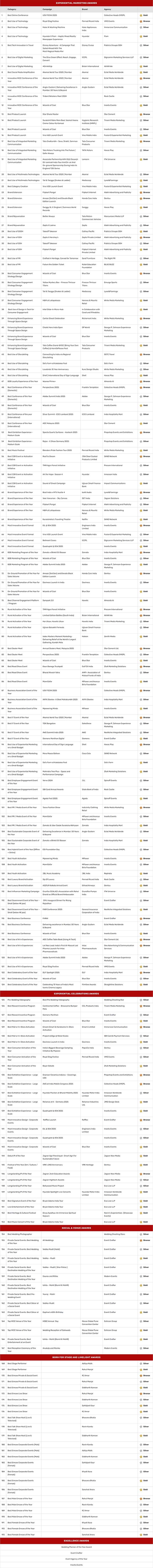 इस साल जूरी की अध्यक्षता इस बार Swiggy के फूड मार्केटप्लेस के CEO रोहित कपूर ने की है। विजेताओं को पांच मुख्य कैटेगरीज में सम्मानित किया जाएगा- Experiential Marketing Awards, Experiential Celebrations Awards, Born For Stage And Limelight Awards, Social And Venue Awards, और Excellence Awards, जिनके अंदर कई सब-कैटेगरी भी हैं।