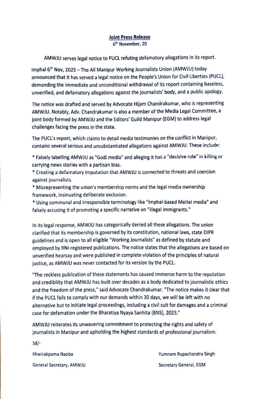 मणिपुर के पत्रकारों के सबसे बड़े संगठन ऑल मणिपुर वर्किंग जर्नलिस्ट्स यूनियन (AMWJU) ने दिल्ली स्थित एक गैर-लाभकारी संस्था पीपुल्स यूनियन फॉर सिविल लिबर्टीज (PUCL) को कानूनी नोटिस भेजा है।
